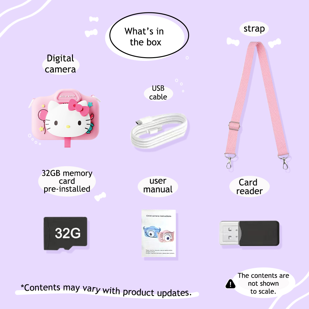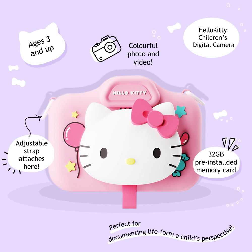 This Hello Kitty camera is the perfect camera designed for children aged 3 and up. It features a large, high-definition touchscreen for easy operation and a built-in selfie camera for added fun. The rear lens cap is cleverly secured to a soft silicone protective case for extra protection. Meet Hello Kitty from Sanrio! She’s a superstar in the Sanrio family! Always full of energy, Hello Kitty is a globally renowned star. Let’s explore the world with Hello Kitty!